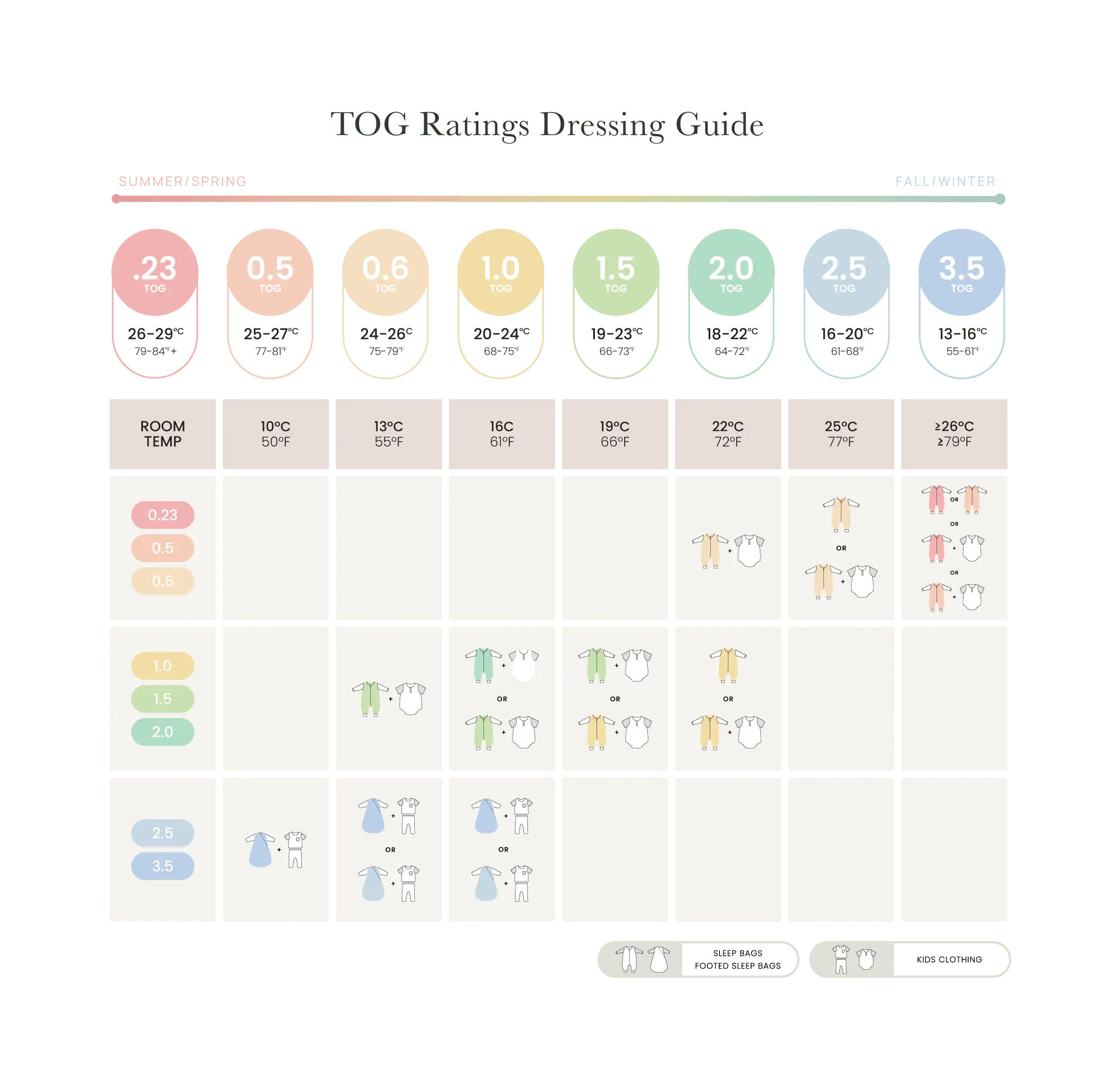 •Use a low TOG rating for warm or hot rooms.Bedrooms that absorb warmth from the sun during the day or stay warm because of the season can be 20 to 26°C (69 to 80°F) or greater. Babies need thin layers at these temperatures and will be more comfortable in sleepwear with a 0.25 to 1.0 TOG rating.